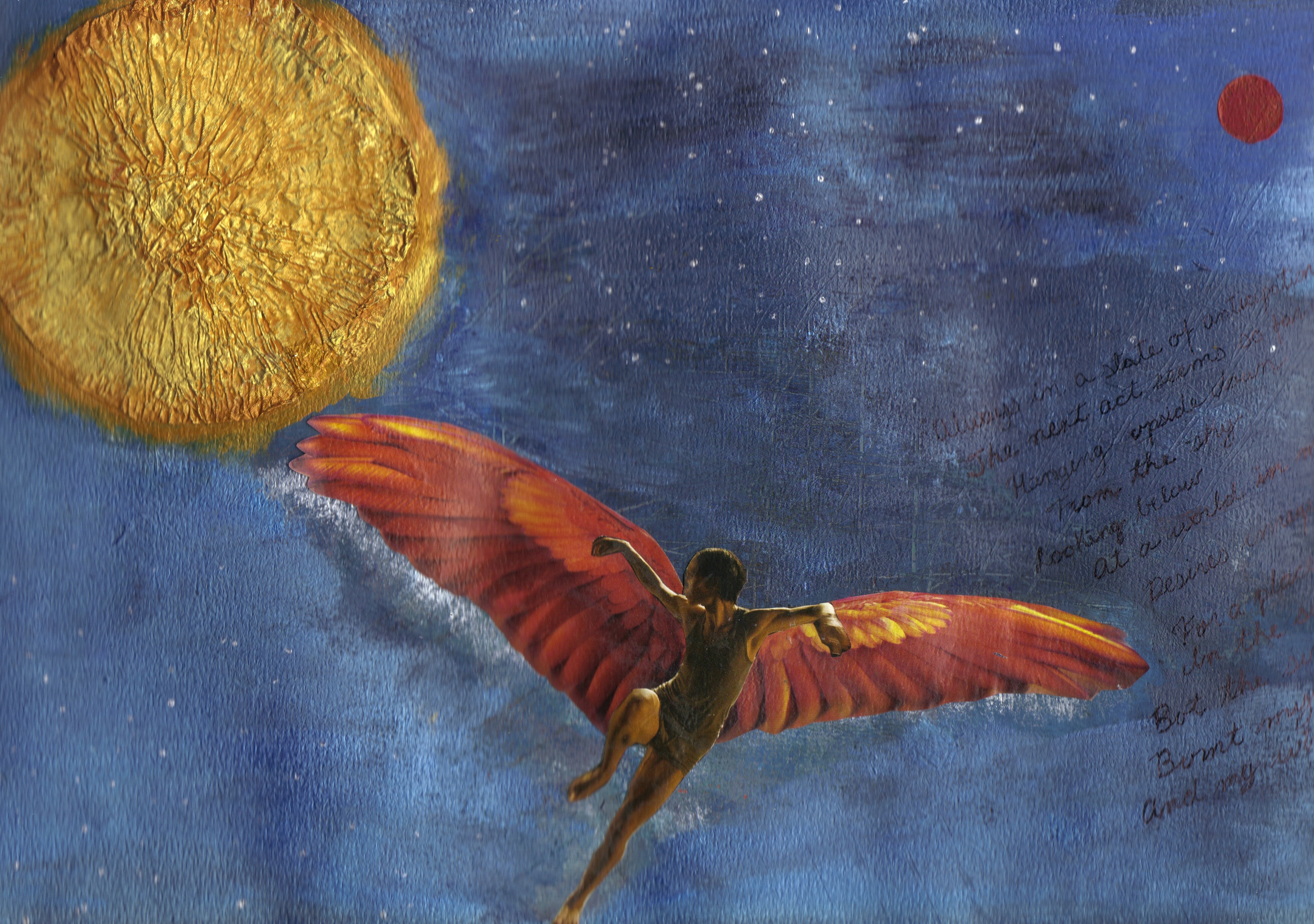 Ode To Icarus-Ωδη Στον Ικαρο Collage and poem by Angela Zafiris Always in a state of anticipation The next act is so far away Hanging upside down from the sky Looking below at a world in motion Desires unrequited For a place in the sun But the sun burnt my skin And my wings. Share this: Click to share on X (Opens in new window) X Click to share on Facebook (Opens in new window) Facebook Click to share on Reddit (Opens in new window) Reddit Click to share on Tumblr (Opens in new window) Tumblr Click to share on Pinterest (Opens in new window) Pinterest Like Loading... Related