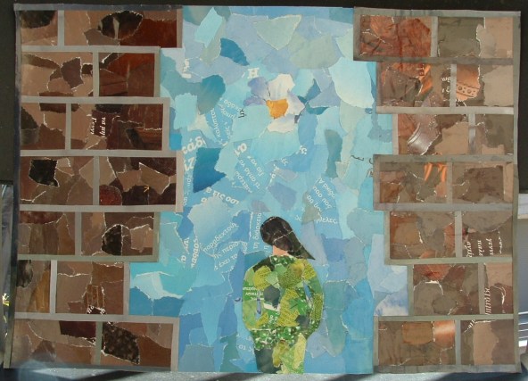 In this collage I used bits of torn blue paper from magazines for the sky. Torn bits of brown paper for the bricks and green for the females’ dress. The papers were glued on 34 x22 cm cardboard paper.