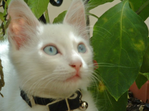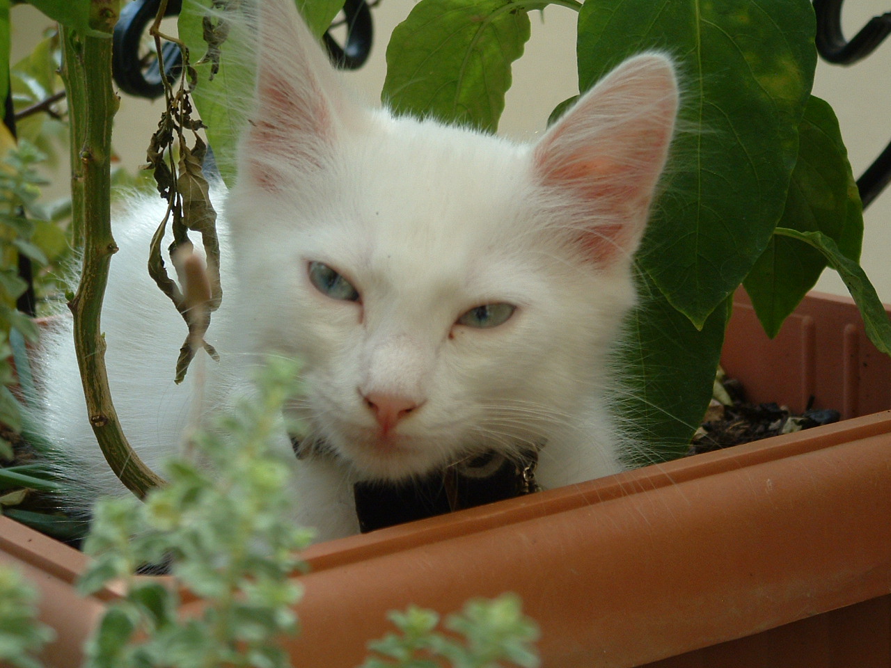 My snow-white, and blue-eyed Turkish Angora cat named Angelo is 3 months old; in human years that equates to 4 years. This cat is like a 4-year-old child, and that explains a lot! I try to keep him in doors most of the time and away from the sun as these type of cats are vulnerable to a form of skin cancer called squamous cell carcinoma . This is why these types of cats are very rare in Greece. Many visitors who have come over mistaken him for a rabbit. But, everyone that came into contact with him, who were not big lovers of cats like myself, have fallen in love with him.