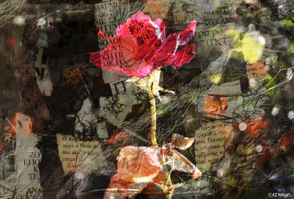 My handmade collage background with a layer of a photograph of a rose that I captured from my garden.