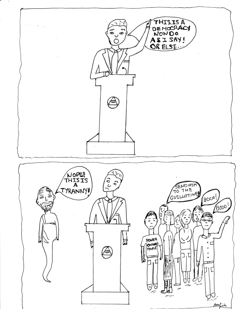 In my drawing the ghost of Cleisthenes (the father of democracy) visits a modern ‘democratic’ leader to give him a lesson on what democracy truly is. Demokratia, or “rule by the people” from demos, “the people,” and kratos, or “power”.
