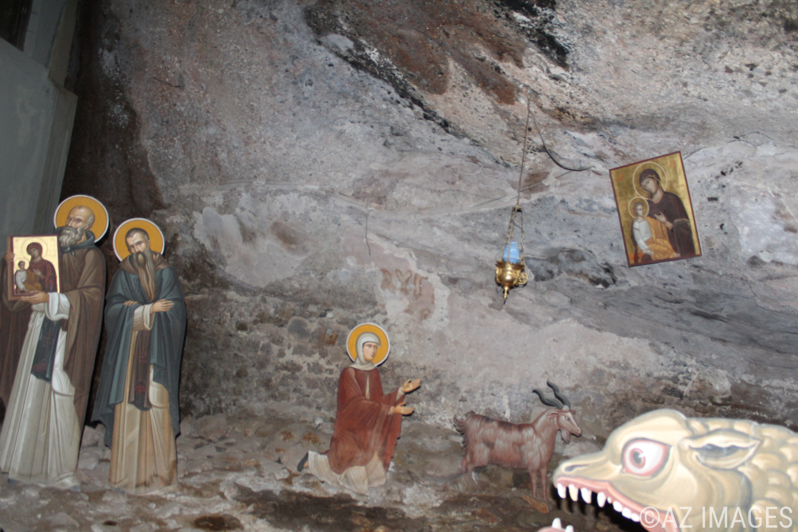 After wandering the brothers met a shepardess named Efrosini who led them to the cave where the icon located. The two monks took the icon out of the cave and cleaned the cave. Then a dragon jumped violently toward the exit and it was killed by thunderbolts.