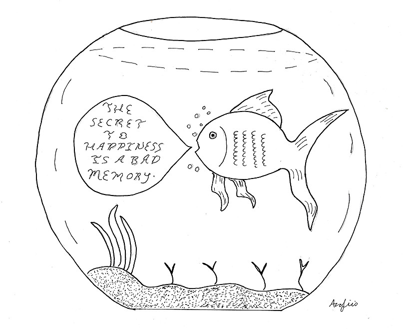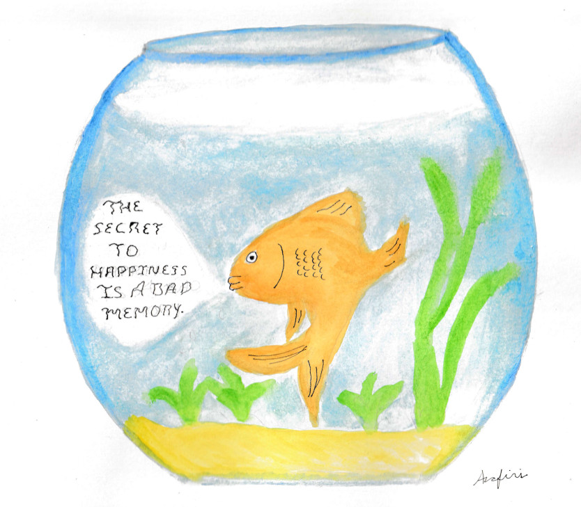 The Goldfish Guru is a happy fish. Due to his bad memory he forgets that his daily routine consists of swimming in a tiny glass bowl day after day.