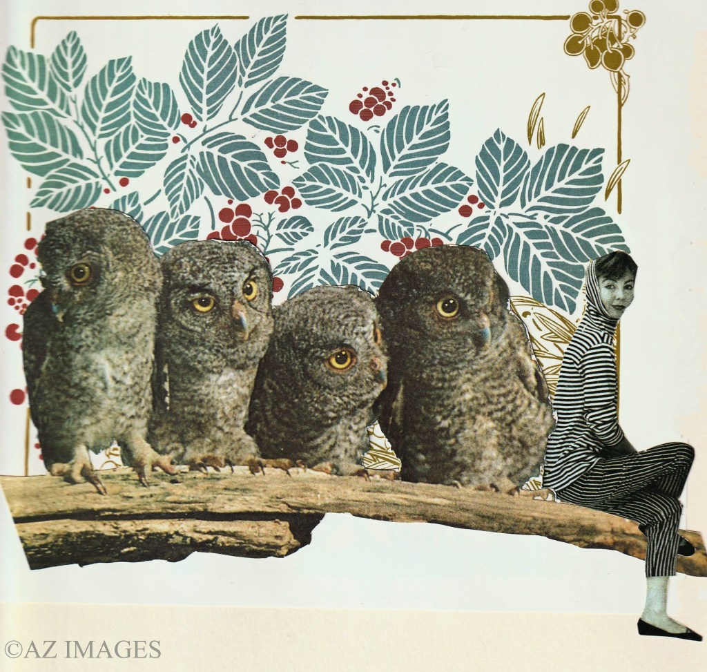You Can’t Sit With Us! ‘You can’t sit with us!’ by Angela Zafiris Another handmade, surreal collage made with images from books. I found the background in a book with pattern design images.