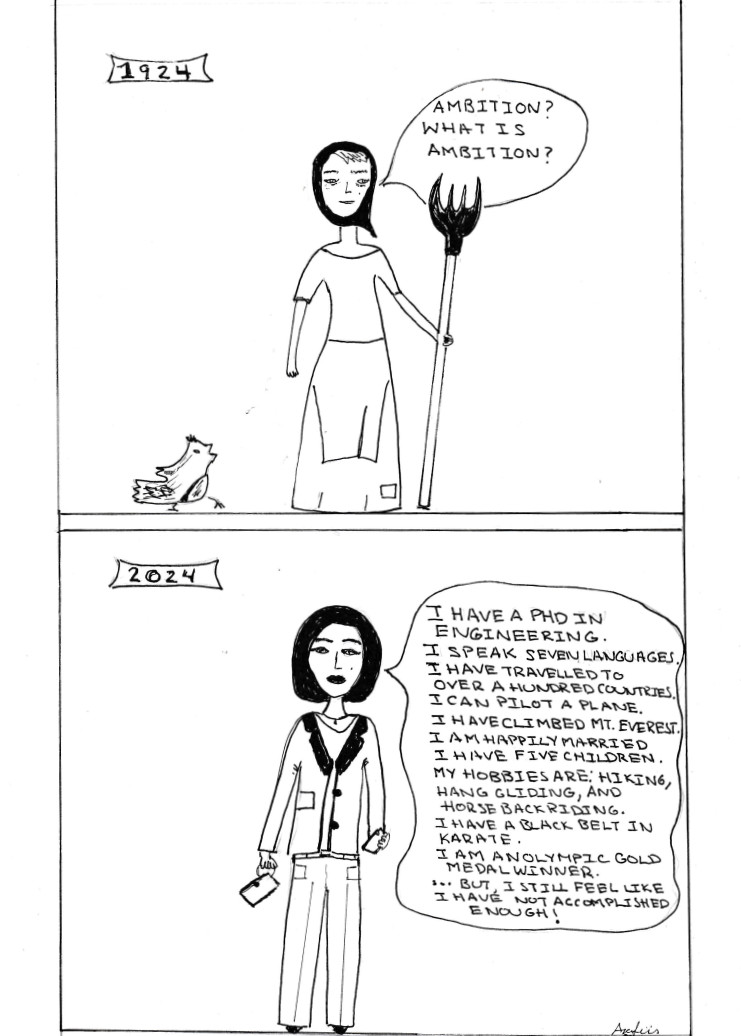 The drawing is a comparison of two generations of women. So much has changed in a hundred years.