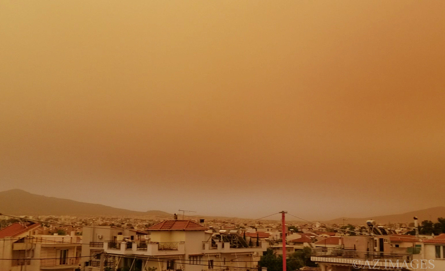 Orange skies over Athens and most parts of Greece and Cyprus on Tuesday. This is probably the third wave of dust from the sahara desert to cover the skies of Greece over the past few weeks. It’s a very eerie sight, almost apocalyptic, like a scene from the futuristic film Blade runner.