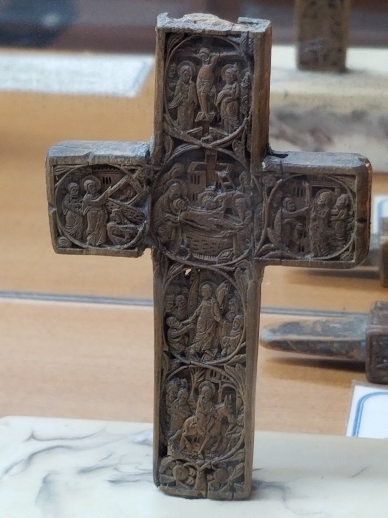 This tiny metallic cross has engravings of the different phases in Jesus’ life.