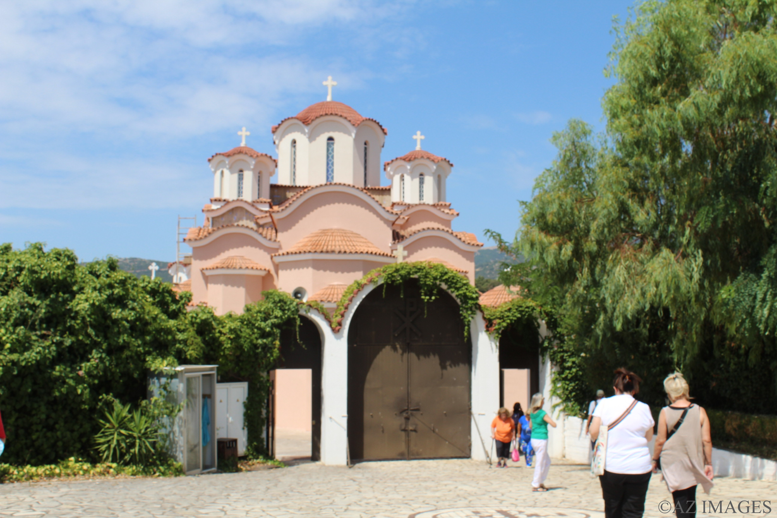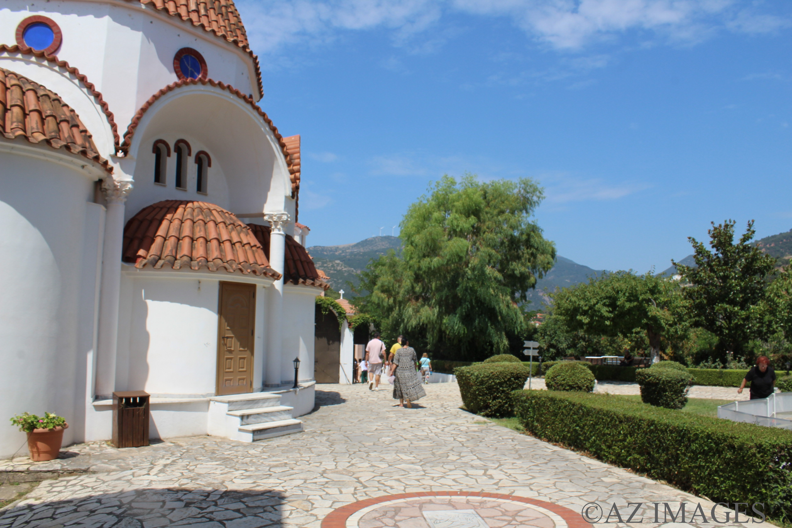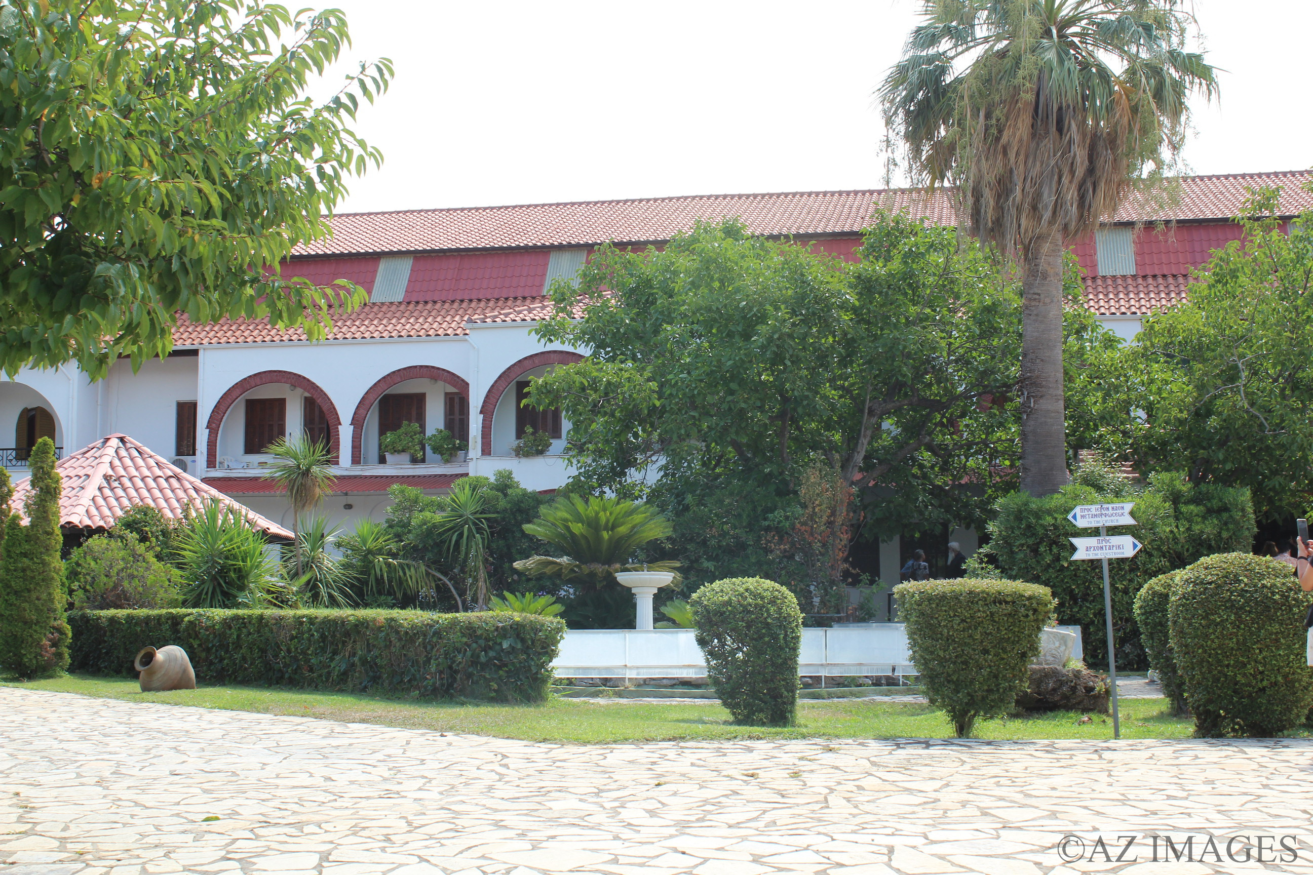 The Holy Monastery of Metamorphosis Sotiros is located on a hill overlooking the picturesque town of Naupaktos in the west of Greece. It is a relatively new monastery that was founded in 1977. The monastery is home to monks, one of which gave us a tour of the monastery. There is a huge conference room, a big library in the basement with books donated by the people, as well as ancient artifacts some replicated and others authentic. There is a beautiful courtyard with birds, and a fish pond and lots of green foliage. There is a smaller church on site called ‘Agios Spridon’. The monks are known for their philanthropic work and do not sell anything on the site aside from their locally made honey.