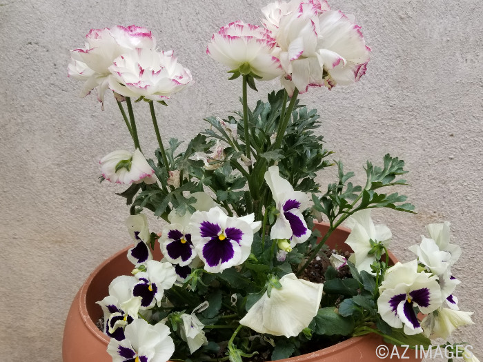 Ranuculus and Pansies sharing a pot