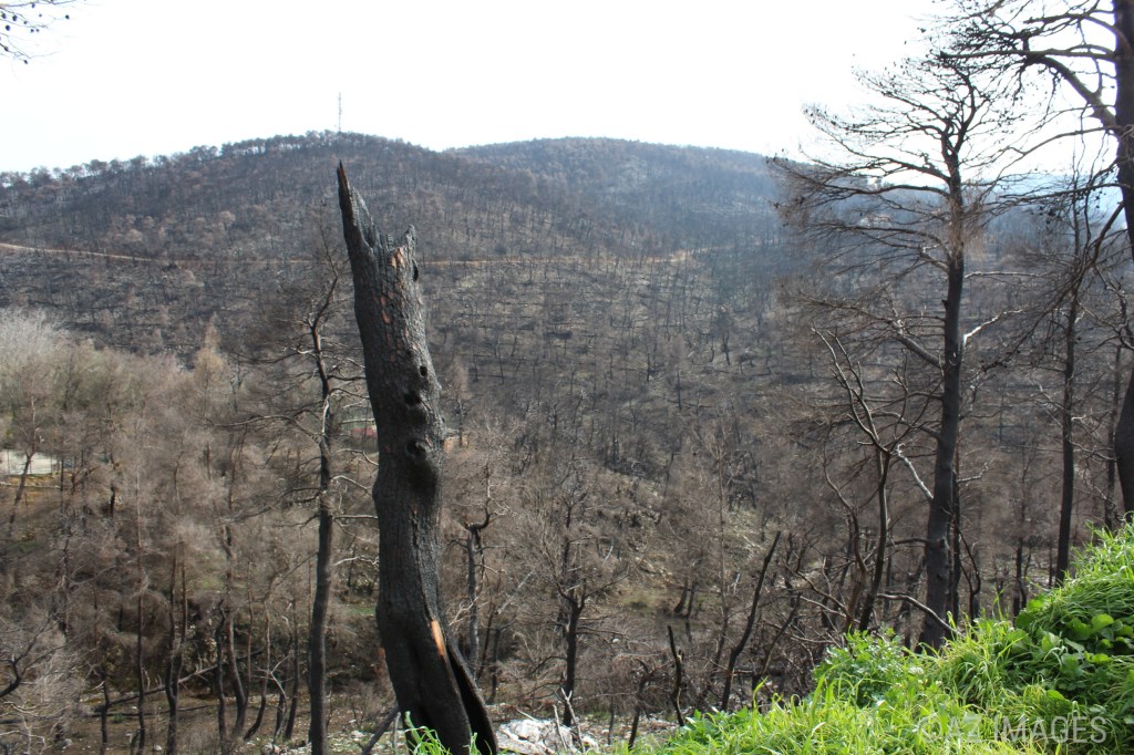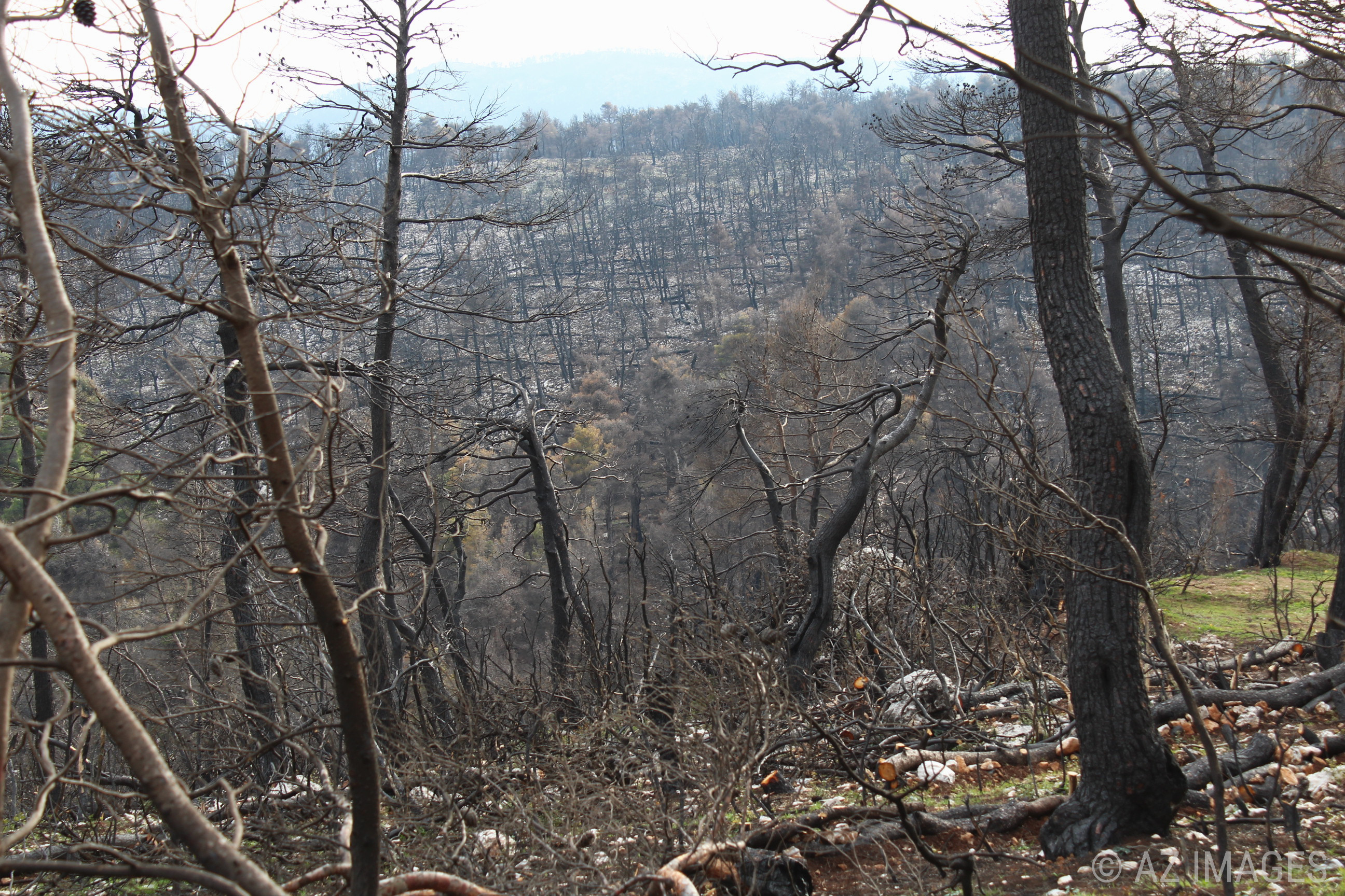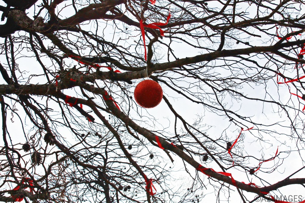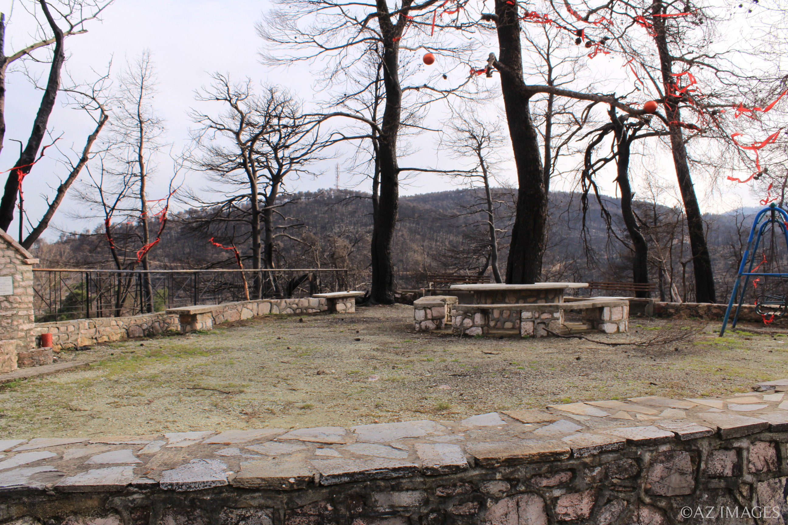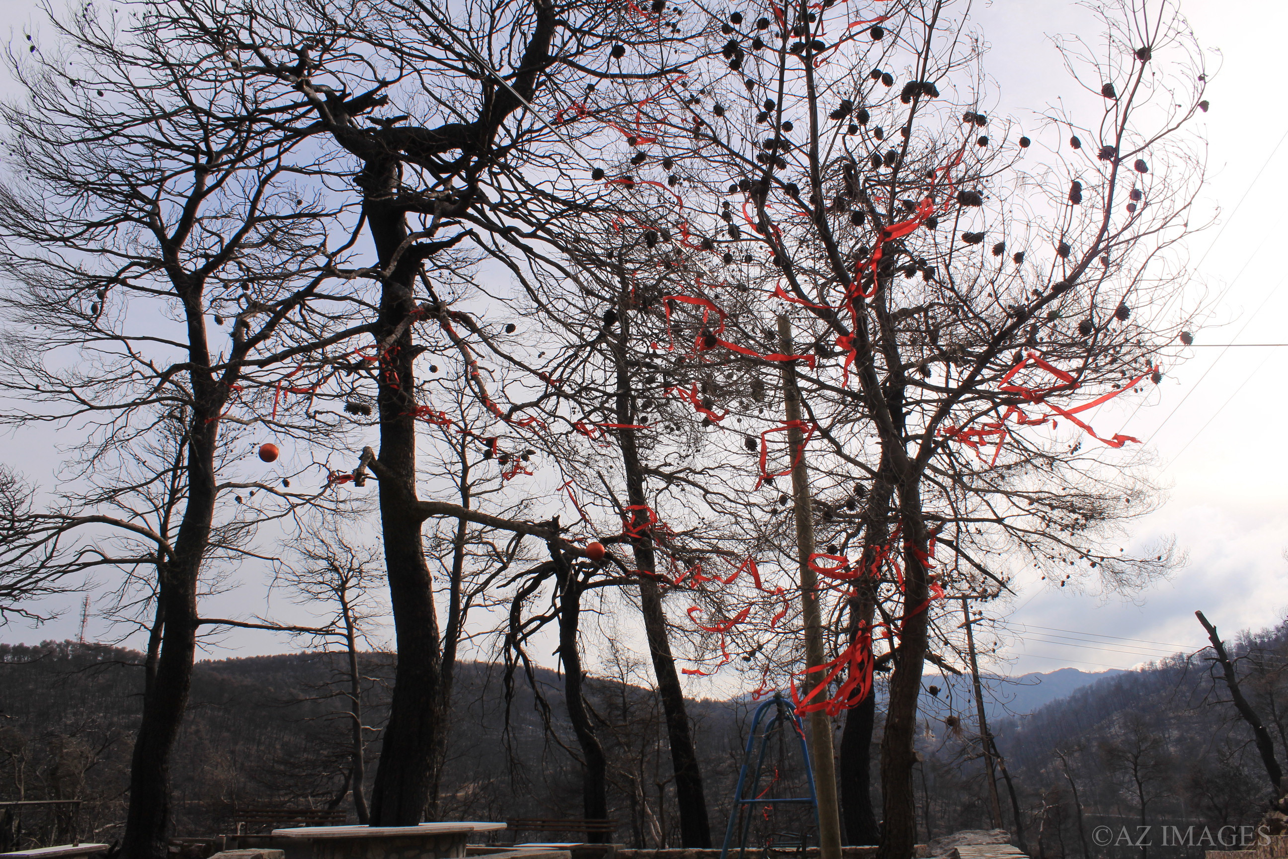 Ενώ έβγαζα φωτογραφίες από τα εκτάρια καμένου δάσους στα περίχωρα της Αθήνας, συνάντησα αυτό το ασυνήθιστο ντεκόρ. Κόκκινη κορδέλα στόλιζε ένα καμένο δέντρο και ένα μοναχικό κόκκινο στολίδι κρεμόταν σε ένα κλαδί.
