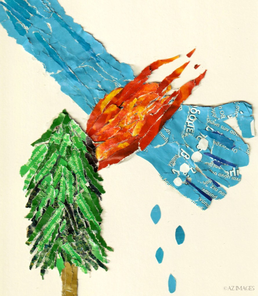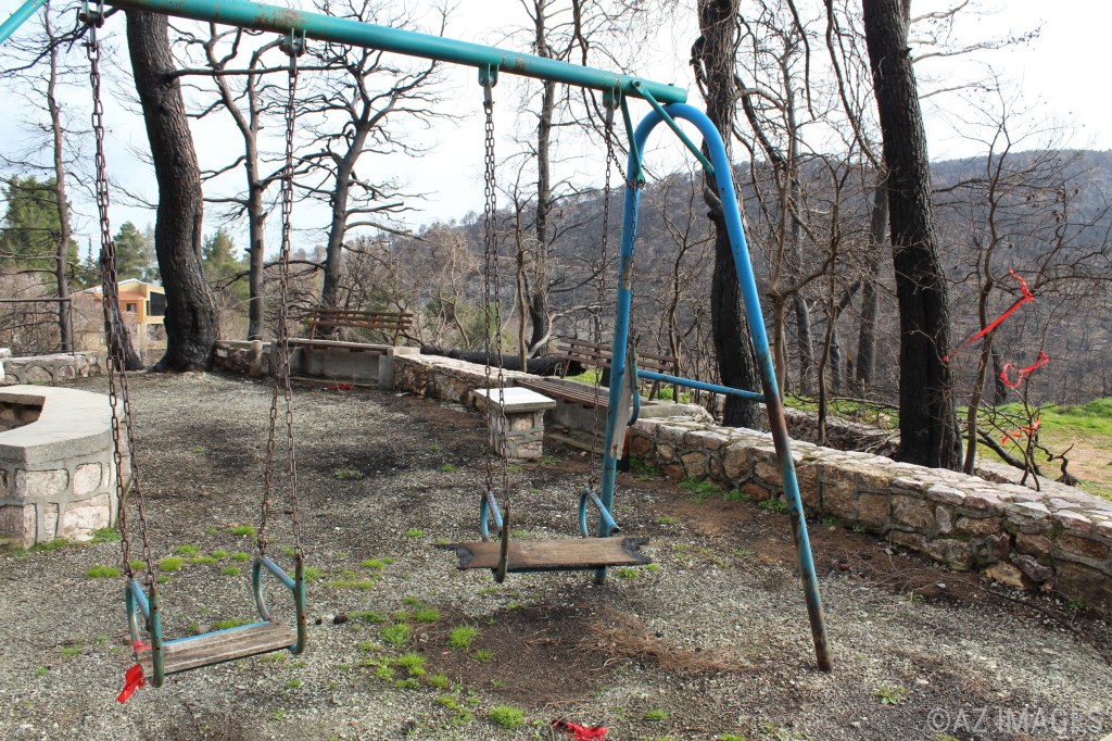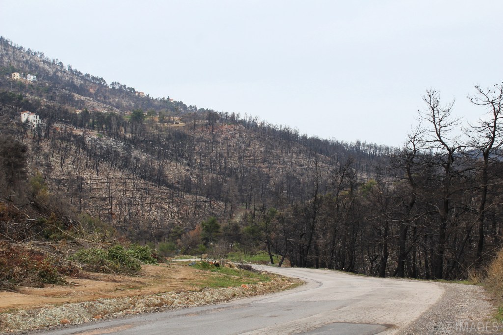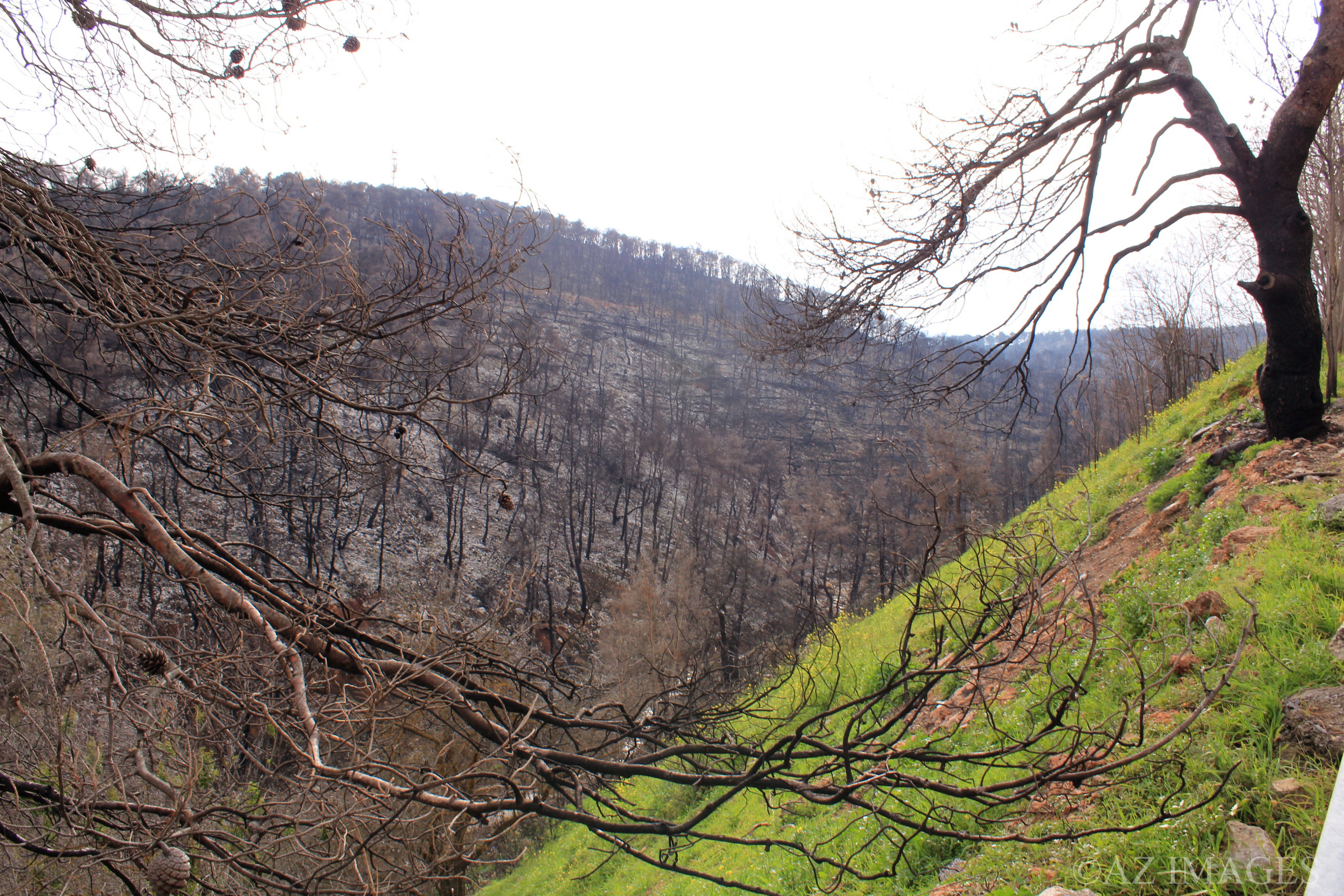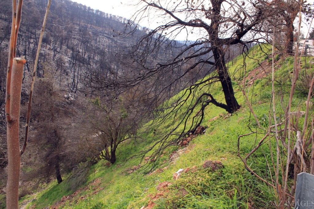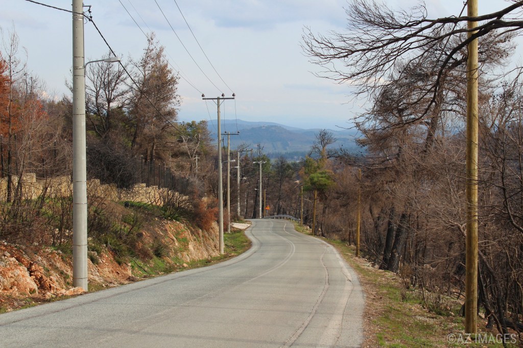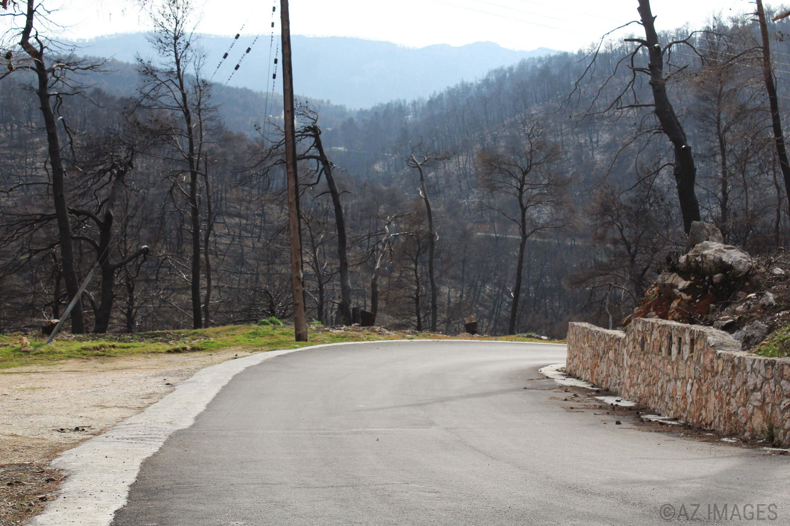 Ενώ έβγαζα φωτογραφίες από τα εκτάρια καμένου δάσους στα περίχωρα της Αθήνας, συνάντησα αυτό το ασυνήθιστο ντεκόρ. Κόκκινη κορδέλα στόλιζε ένα καμένο δέντρο και ένα μοναχικό κόκκινο στολίδι κρεμόταν σε ένα κλαδί.