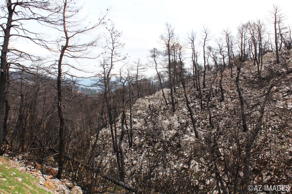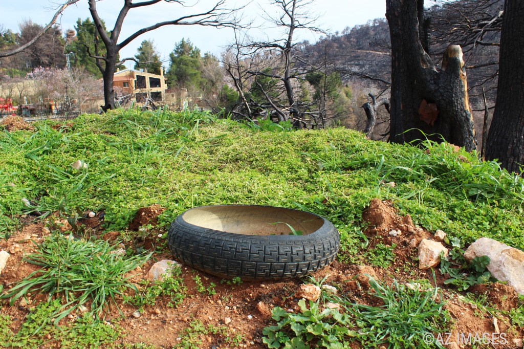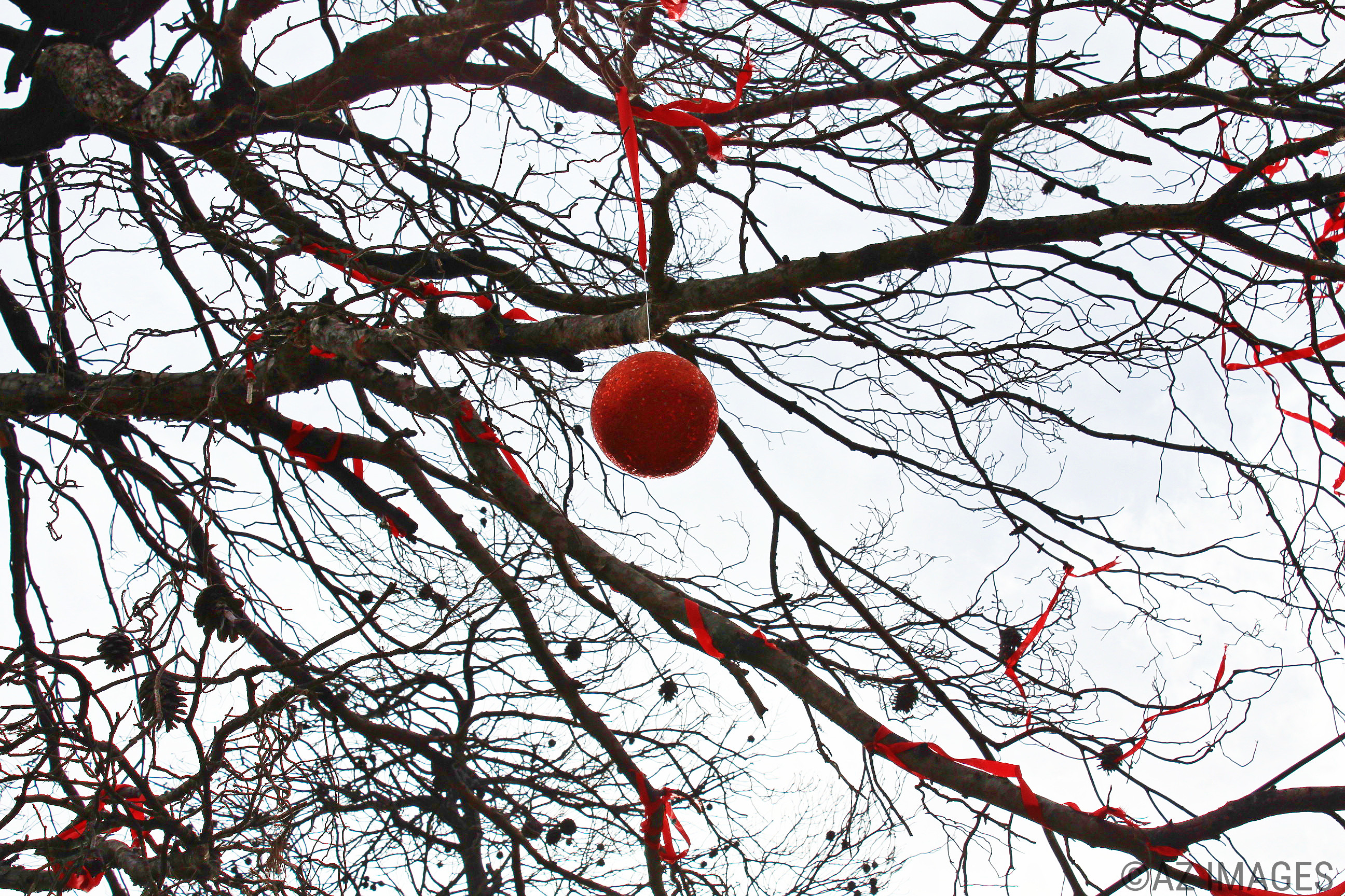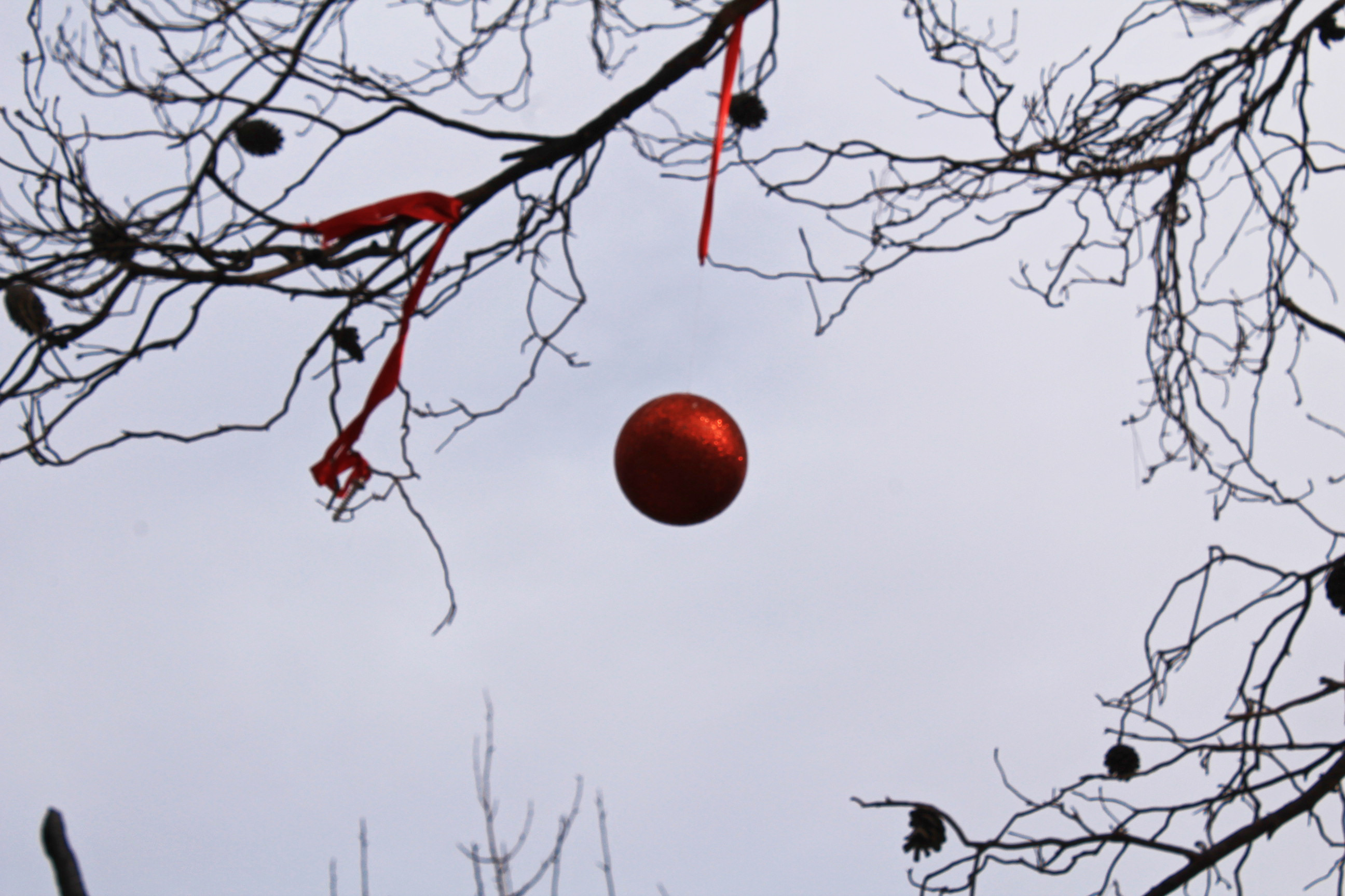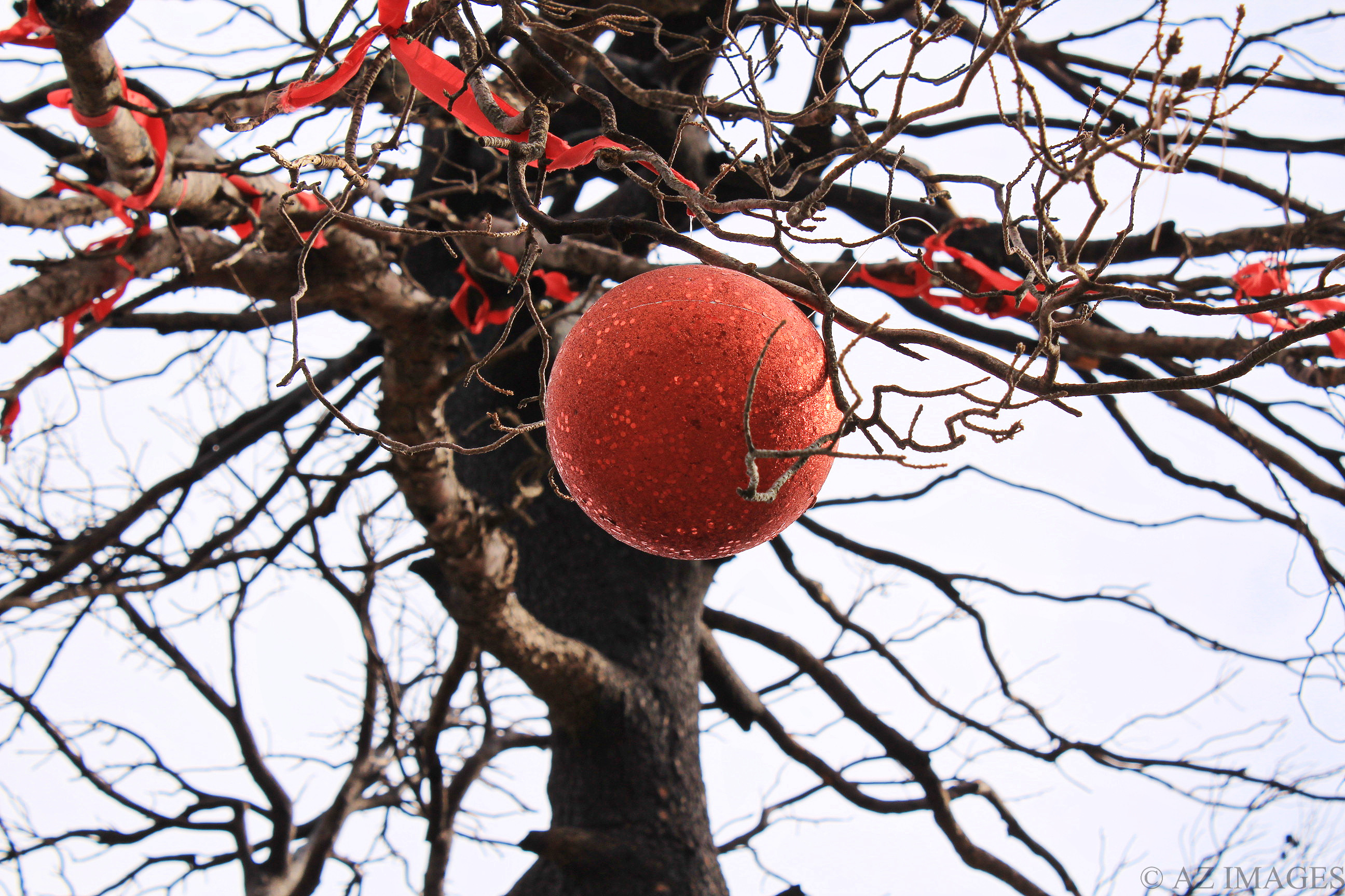 Whilst taking photographs of the hectares of burnt forest on the outskirts of Athens I came across this unusual decor. Red ribbon adorned a burnt tree and a lone red ornament hung on a branch.