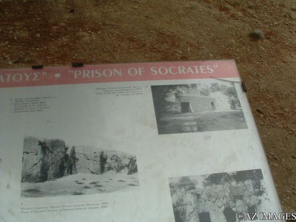 Just below the Acropolis lies a very arid and ancient park on Philopapou hill. The park has a strange of atmosphere as do many places that have such a rich history. There were hardly any visitors in the park that day, and as I was walking and taking photographs I noticed a cave with rusty iron bars on it. It crossed my mind that it could be Greek philospopher Socrate’s prison. I had about it a while ago, but I wasn’t sure about were its exact location might be . As I got closer to the sign I saw that it was were he was kept imprisoned and I was thrilled to see it up close.