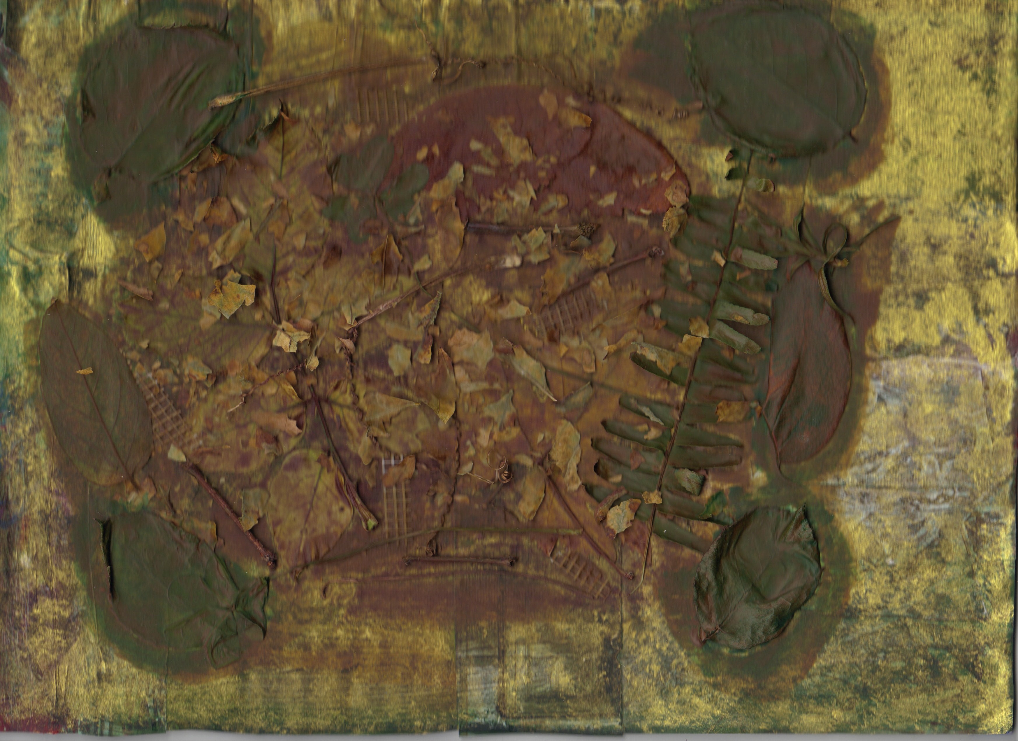 Another day another art attack.  I decided to do something different and make a painting with some leaves from my backyard. I gathered some leaves and twigs and glued them on to the canvas.  I have some great glue! I used gold paint on pieces of textured paper.  Everthing glued together well and now the artwork  is hanging on my bedroom wall 🙂