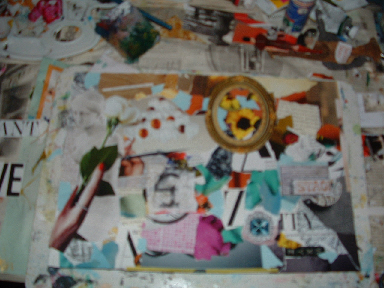 The first photograph is my collage at its first stage before being completely altered. After all the images got glued down on cardboard paper. I let it dry for a few hours. I then added a white wash to blend everything together. After the wash dried I painted over it with phthalocyanine blue. It was too dark, so I used burnt sienna mixed with a bit of titanium white acrylic to tone down the dark blue. It looked a lot better. Then I added the images and the text. I thought that the text stood out too much so I glued tissue paper over the text. A crimson acrylic was then applied with a key card, to make a border which is not seen in photo. The basic key to making a collage is layering and more layering and use just a couple of colours.